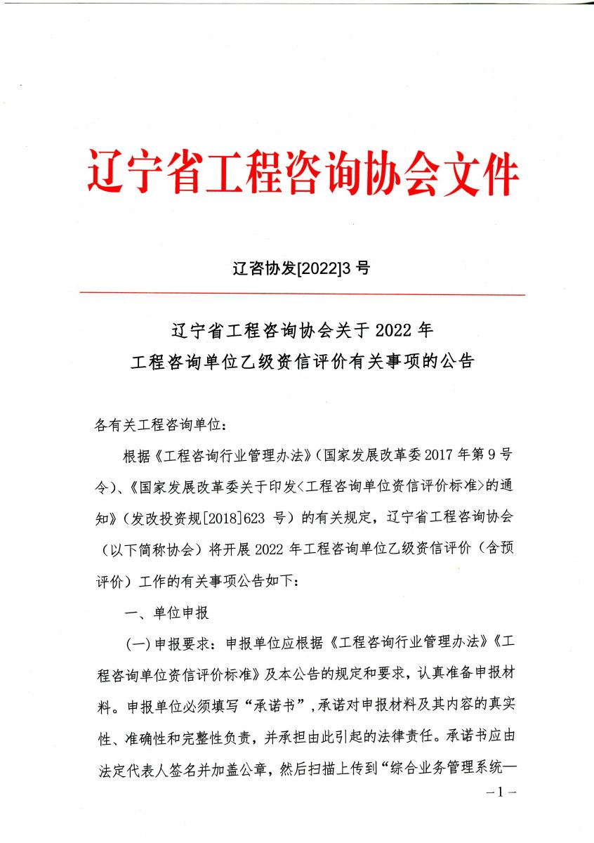遼寧省工程咨詢協會關于2022年工程咨詢單位乙級資信評價有關事項的公告