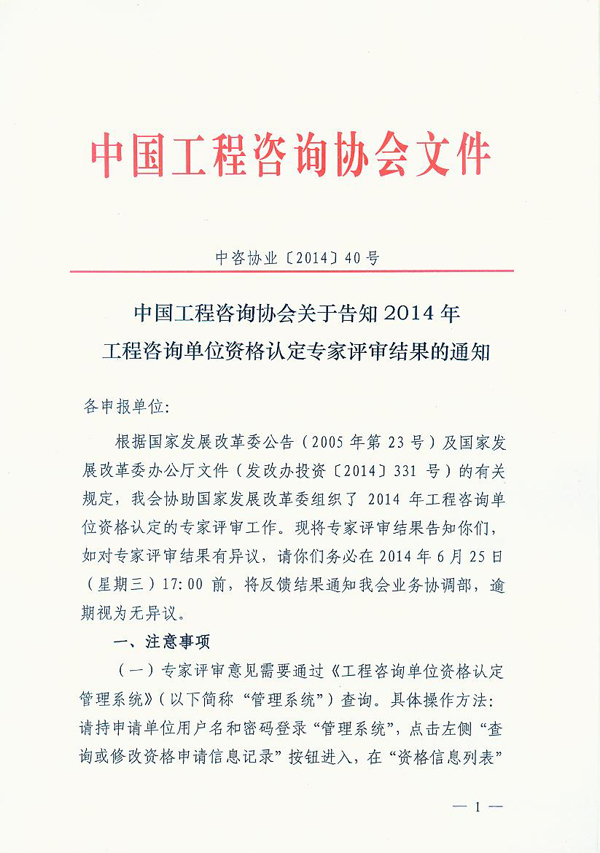 中國工程咨詢協會關于告知2014年工程咨詢單位資格認定專家評審結果的通知