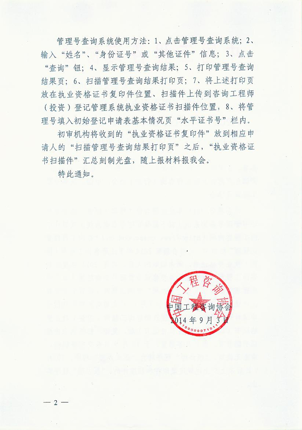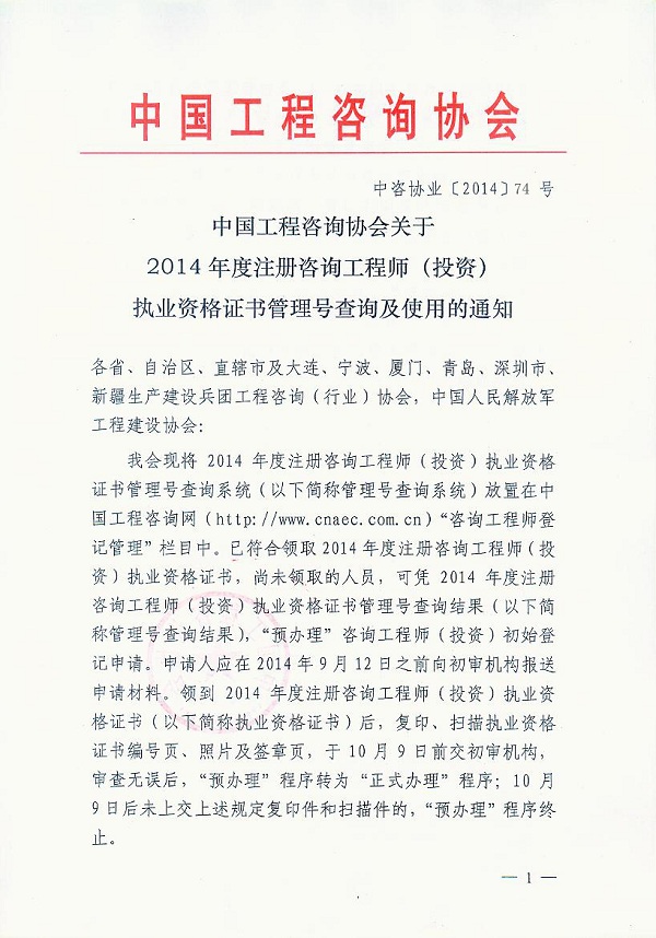 中國工程咨詢協會關于2014年度注冊咨詢工程師(投資)執業資格證書管理號查詢及使用的通知