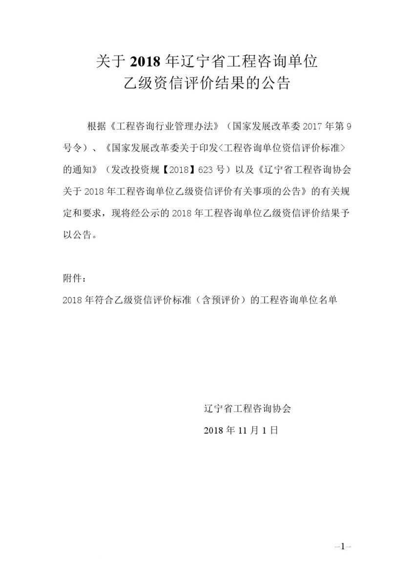 關于2018年遼寧省工程咨詢單位乙級資信評價結果的公告