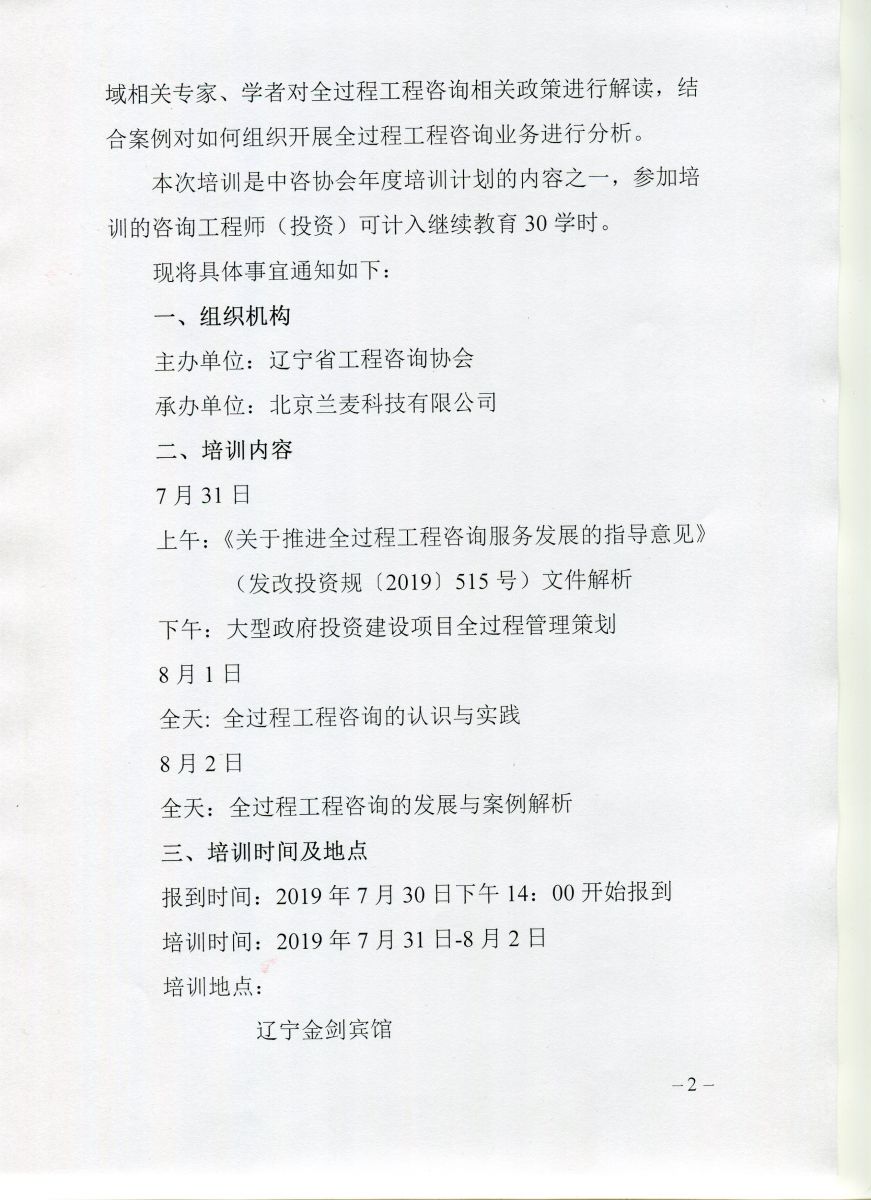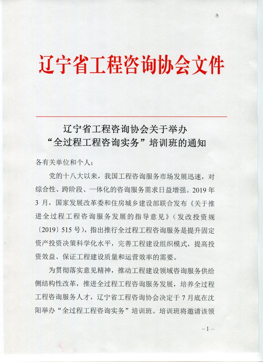 遼寧省工程咨詢協(xié)會關(guān)于舉辦 “全過程工程咨詢實務(wù)”培訓(xùn)班的通知