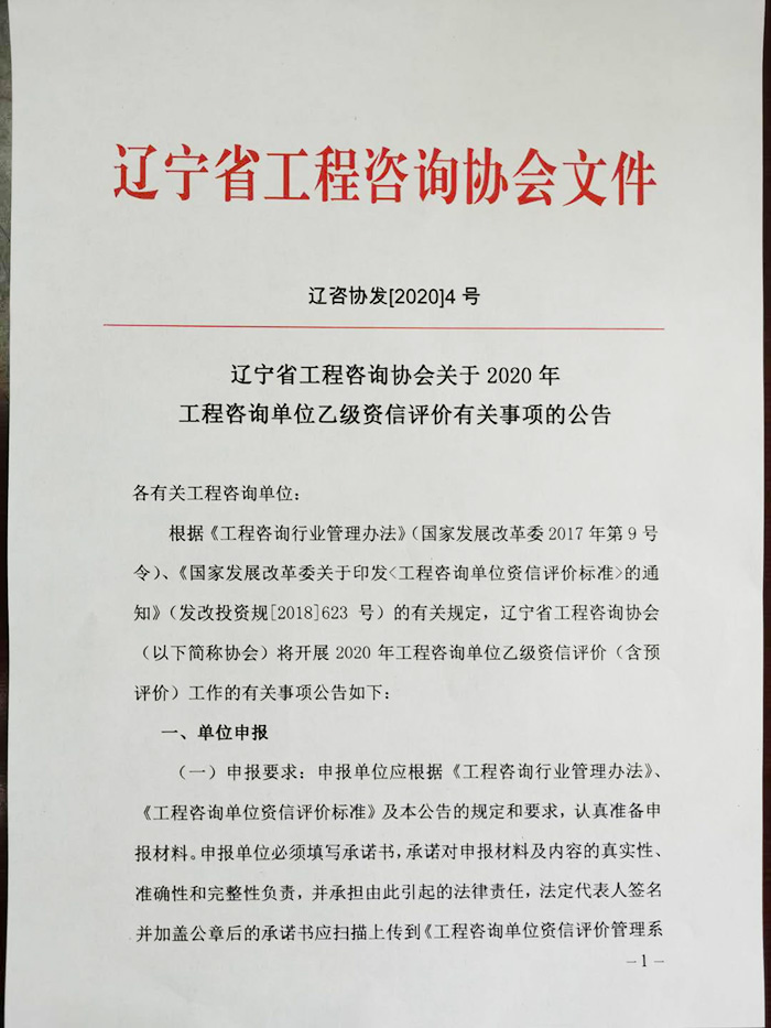 遼寧省工程咨詢協(xié)會關于2020年 工程咨詢單位乙級資信評價有關事項的公告